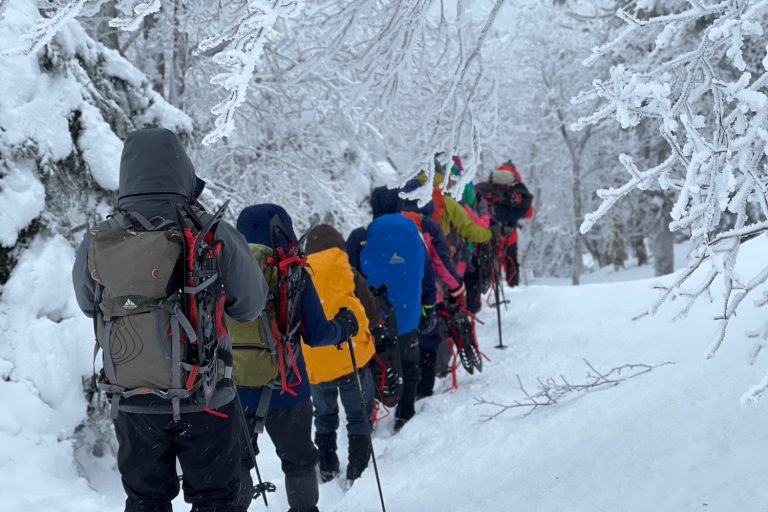 This guided snow trekking tour aims for the giant icefall, Senninzawa Ice Garden, in Zao. On the way there, you will wear crampons and hike for about an hour while listening to the guide’s commentary. For the return trip, you will change into snowshoes to descend. There will be a lunch break during descent (please bring your own lunch).